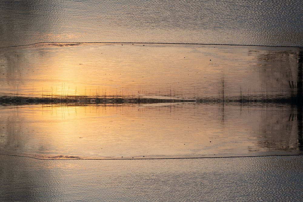 Diese symmetrische Komposition ist dem entspannenden Ambiente am Wasser, dem gespiegelten Bild der Natur und den magischen Farben bei Sonnenuntergang im Winter gewidmet. Goldenes Sonnenlicht wird an der Oberfläche des Wassers reflektiert. Darüber hinaus ist die Szene von dunklen Blautönen und silbergrauen Lichtreflexen geprägt. Zugefrorene Bereiche, aber auch sanfte Bewegungen und die wellenförmige Struktur des Wassers verleihen dem Spiegelbild der Natur eine abstrakte Erscheinung. Dieser Effekt wird durch die Spiegelung der Spiegelung betont. Gräser am Ufer und ein Baum erscheinen als verschwommene Silhouetten.
