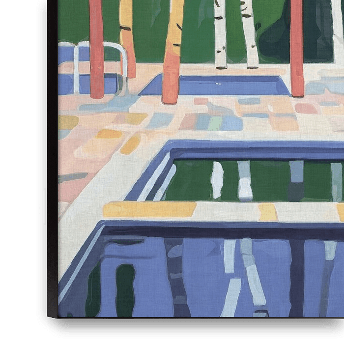 Spiegelungen der Birken im Pool Nr. 2. Es ist ein Sommertag und die Birken auf der Terrasse spiegeln sich im Hauptpool wider: Die Terrasse besteht aus pastellfarbenen Fliesen, die die Farben der Stämme und Blätter der Birken ergänzen.