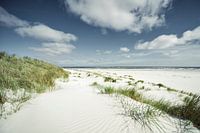 Die Landschaftsfotografie "Spiekeroog I" zeigt mit Gräsern bewachsene Sanddünen unter einem tiefblauen Himmel. Vereinzelte Cumulus Wolken ziehen über den Strand der Ostfriesischen Insel in der Nordsee. Aufgenommen an einem sonnigen Morgen zu Beginn des Sommers 2017.