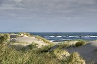 Die Landschaftsfotografie "Spiekeroog IV" zeigt mit Gräsern bewachsene Sanddünen im Seitenlicht. Vor einem blauen Himmel über der Nordsee fliegt eine Möwe über den Strand der Ostfriesischen Insel. Aufgenommen an einem sonnigen Morgen zu Beginn des Sommers 2017.