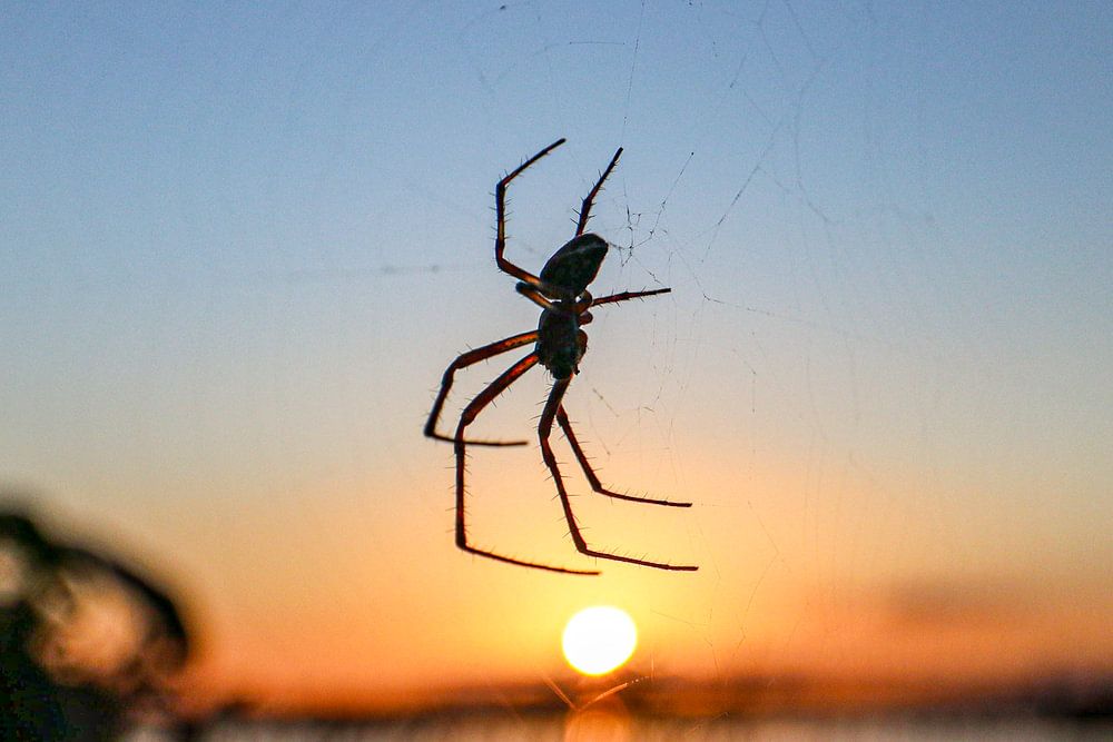 Im Vordergrund ist eine Spinne in ihrem Netz zu sehen, während im Hintergrund die Landschaft in den warmen Farbtönen des Sonnenuntergangs erstrahlt.