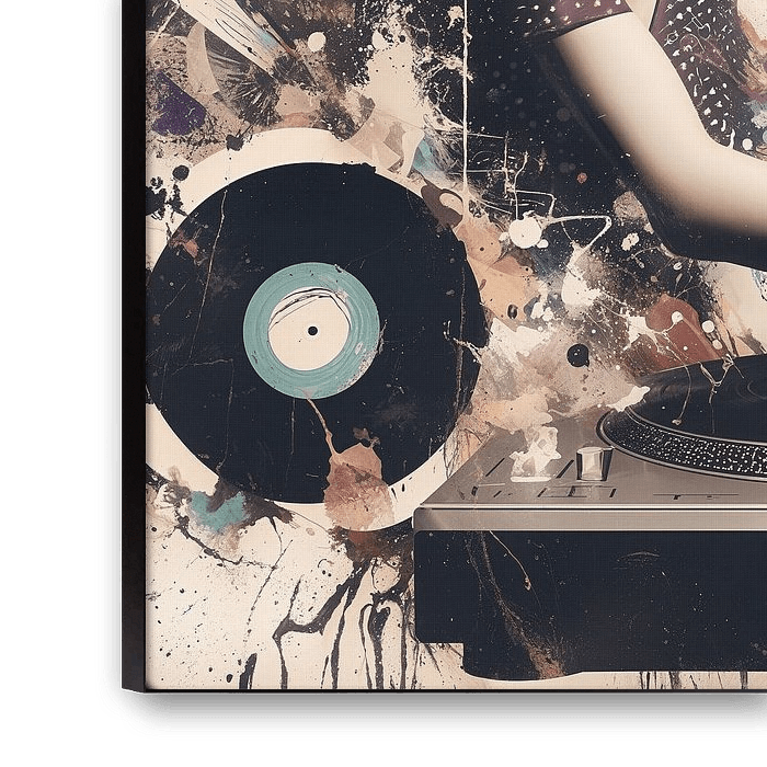 Ein Street-Art-Gemälde, das einen weiblichen DJ in seinem Element zeigt. Dieses Kunstwerk fängt die Energie und Dynamik der DJ-Kultur ein und kombiniert sie mit dem rohen und ausdrucksstarken Stil der Street Art.