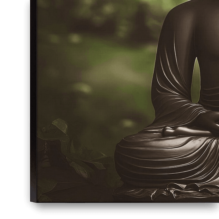 Ein meditativer Buddha sitzt im klassischen Lotussitz, umgeben von einer natürlichen, grünen Umgebung. Der Buddha hat einen ruhigen Gesichtsausdruck mit geschlossenen Augen, der inneren Frieden, Meditation und Erleuchtung symbolisiert. Das weiche Licht und der dschungelartige Hintergrund schaffen eine harmonische und spirituelle…