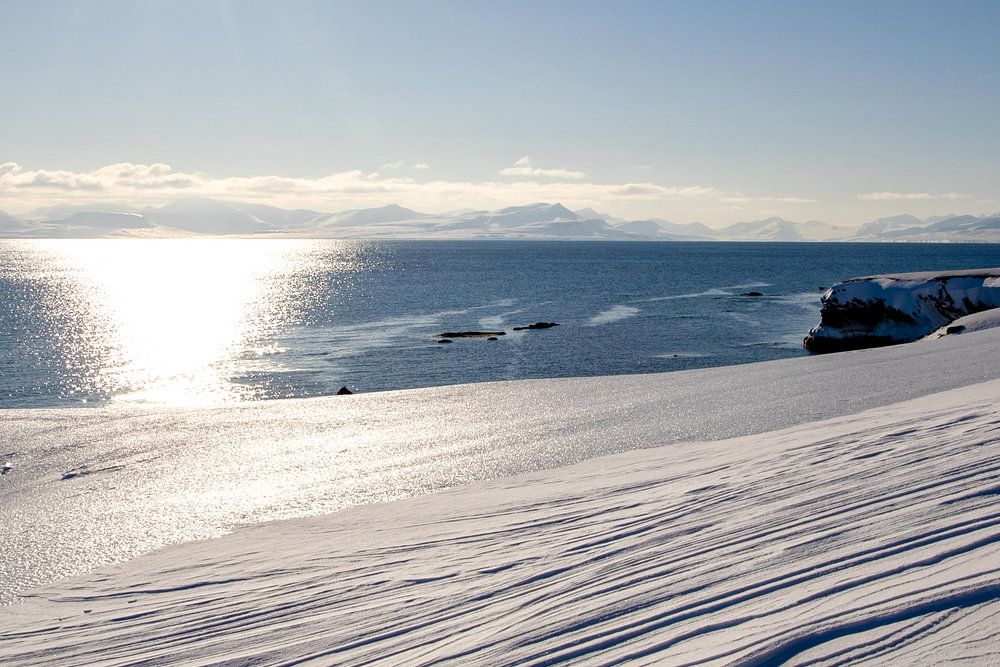 Während eines Spaziergangs durch eine wunderschöne Schneelandschaft am Meer im zeitigen Frühjahr auf Spitzbergen / Spitzbergen, aufgenommen mit Gegenlicht aus tief stehender Sonne.