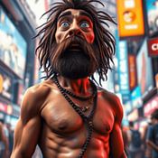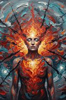 Eine weibliche Figur mit geschlossenen Augen schwebt in einem unruhigen, graublauen Raum. Ihr Körper öffnet sich und zerfällt in Stücke, als wäre sie aus Glas oder Leder, das zerreißt. Es explodieren orangefarbene, rote und gelbe Flammen, die aus den Rissen hervorspringen und wie rohe Energie pulsieren. Schwarze Linien wie Risse oder…