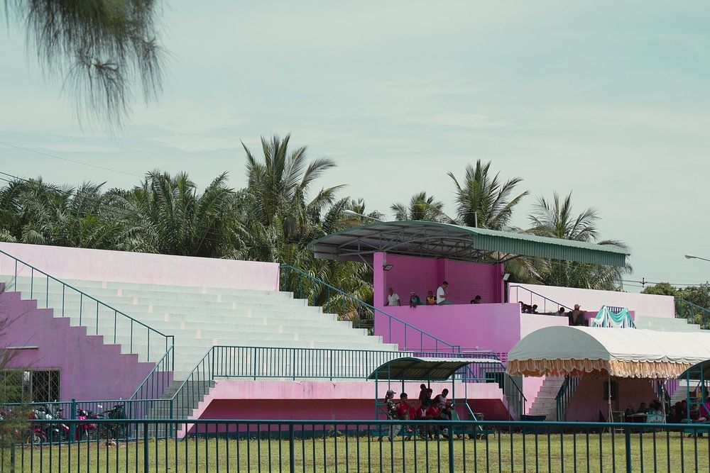 Foto eines Sportplatzes in Krabi, Thailand, mit leuchtend rosa Farbe im Kontrast zu grün.