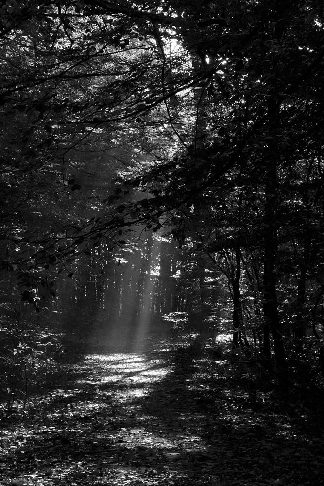 "Ihr Weg ist beleuchtet", frühe Sonnenstrahlen weisen den Weg durch den Wald von Gieten-Borger Forstwirtschaft in Drenthe.