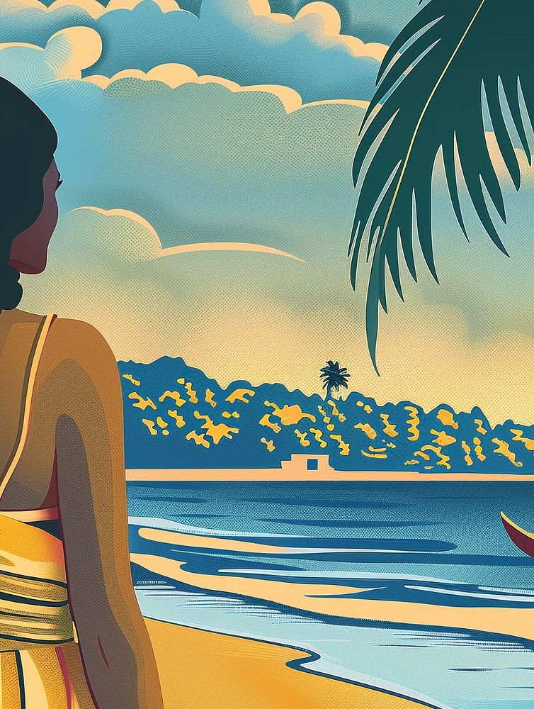 Fangen Sie den Geist der goldenen Strände Sri Lankas mit diesem atemberaubenden Retro-Reiseposter ein. Die Illustration zeigt eine Frau in traditioneller Kleidung und ein Kind, die an einem sonnenüberfluteten Strand spazieren gehen und auf das ruhige blaue Wasser blicken, wo ein Fischerboot auf sie wartet. Palmen und üppiges Grün rahmen die Komposition ein, während dramatische Wolken an das schwüle Klima und die pulsierende Energie der Insel erinnern. Dieses Kunstwerk verbindet kunstvoll Kultur und Natur und ist damit eine einzigartige Ergänzung für das Zuhause von Weltreisenden, Meeresträumern und allen, die sich von der Romantik des Indischen Ozeans angezogen fühlen. Hängen Sie es in Ihrem Wohn-, Schlaf- oder Arbeitsbereich auf und lassen Sie die Farben und die entspannte Eleganz des srilankischen Küstenlebens auf sich wirken. Dieses Poster ruft Momente der Besinnung und der Freude an der Verbundenheit hervor und erinnert Sie daran, langsame Spaziergänge, warmen Sonnenschein und die stimmungsvolle Schönheit der Küstenlinie Sri Lankas zu genießen. Es ist nicht nur Wandkunst - es ist eine Einladung, die Seele eines der bezauberndsten Reiseziele Asiens zu entdecken.