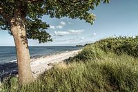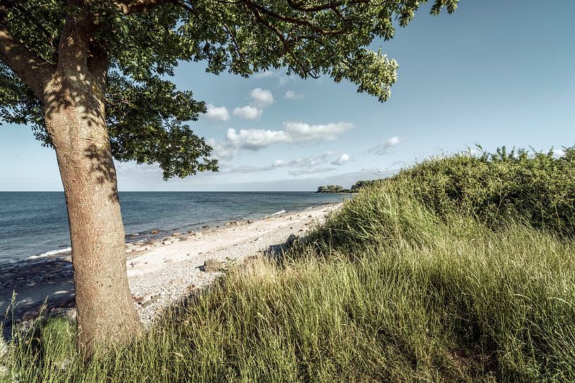 Die Landschaftsfotografie "Staberhuk I" zeigt den menschenleeren Strand nahe des Ortes Staberdorf auf Fehmarn. Im Vordergrund führt der Blick von einer alten Esche über die mit Gräsern bewachsene Steilküste zur Horizontlinie über der ruhigen Ostsee. Aufgenommen an einem sonnigen Tag im Sommer 2018.