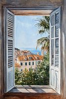 Stadt am Meer mit Palmen - Dieses Ansichtsbild zeigt ein offenes Fenster mit Fensterläden, hinter dem ein beruhigender Blick auf eine Küstenstadt mit Terrakotta-Dächern und einem klaren blauen Meer zu sehen ist, umgeben von grünen Palmen und einem klaren Himmel.