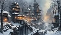eine Stadt in einem winterlich verschneit Wald, Abendstimmung