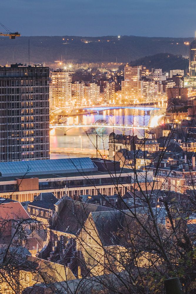 Blick über die Maas und die bunt beleuchtete Stadt Lüttich von der Zitadelle aus während der blauen Stunde. Dieses Foto ist auch im Querformat erhältlich.
