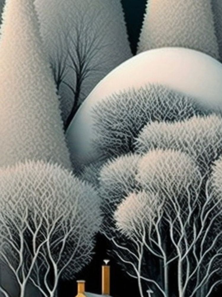 Die winterliche Szene zeigt eine friedliche, stilisierte Siedlung eingebettet in einen Wald schneebedeckter Bäume. Die Häuser präsentieren sich in sanften Pastelltönen wie Blau, Gelb und Rosa, mit einfachen Formen und Fenstern. Die Bäume dominieren die Landschaft mit ihren weißen, kegelförmigen Kronen und zarten, sichtbaren Ästen. Der dunkle, nachtblaue Hintergrund verstärkt die helle Erscheinung des Schnees und der Häuser, wodurch eine ruhige und fast surreale Atmosphäre entsteht.