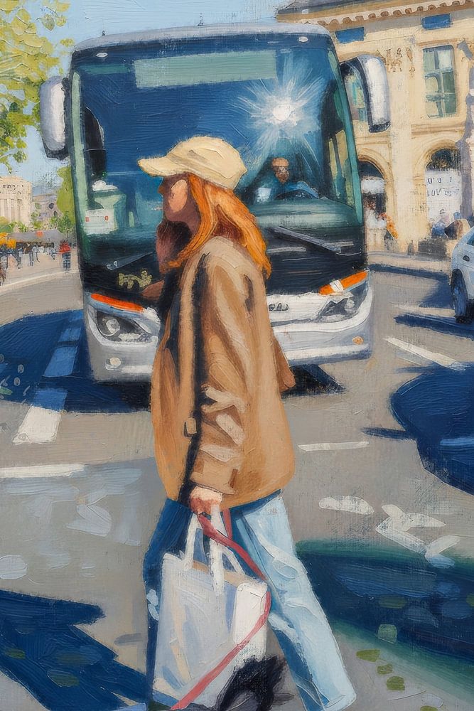 In diesem Werk fange ich ein alltägliches Stadtbild ein, in dem Bewegung und Stille aufeinander treffen. Eine Frau überquert mit ihrem Hund eine belebte Straße, umgeben von Verkehr, Architektur und dem hellen Licht eines sonnigen Tages. Die Szene strahlt Dynamik aus: der herannahende Bus, wartende Autos, scharfe Schatten, die über den…
