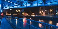 Diese coole Nachtaufnahme von Aalst in Ostflandern unter der Eisenbahnbrücke am Fluss Dender fängt den auffälligen Kontrast zwischen der beleuchteten Stadtlandschaft und dem ruhigen Wasser darunter ein. Die architektonischen Elemente der Gebäude und der Eisenbahnbrücke vermitteln ein Gefühl von städtischer Härte und Energie, die der…