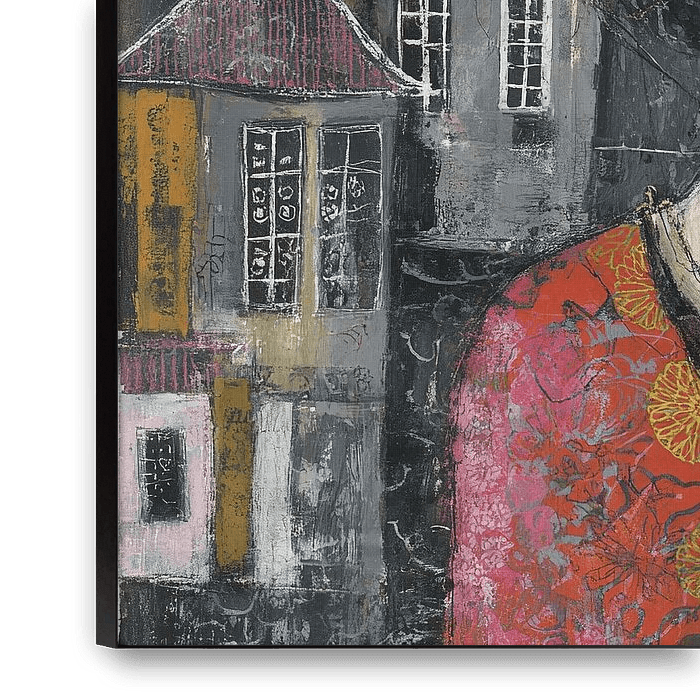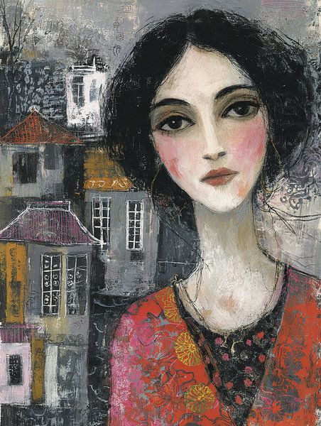 Städtisches Porträt einer Frau – Dies ist ein Gemälde einer Frau mit einem markanten Gesicht und schönen, großen Augen, umgeben von Häusern in verschiedenen Farben, die eine städtische Atmosphäre ausstrahlen.
