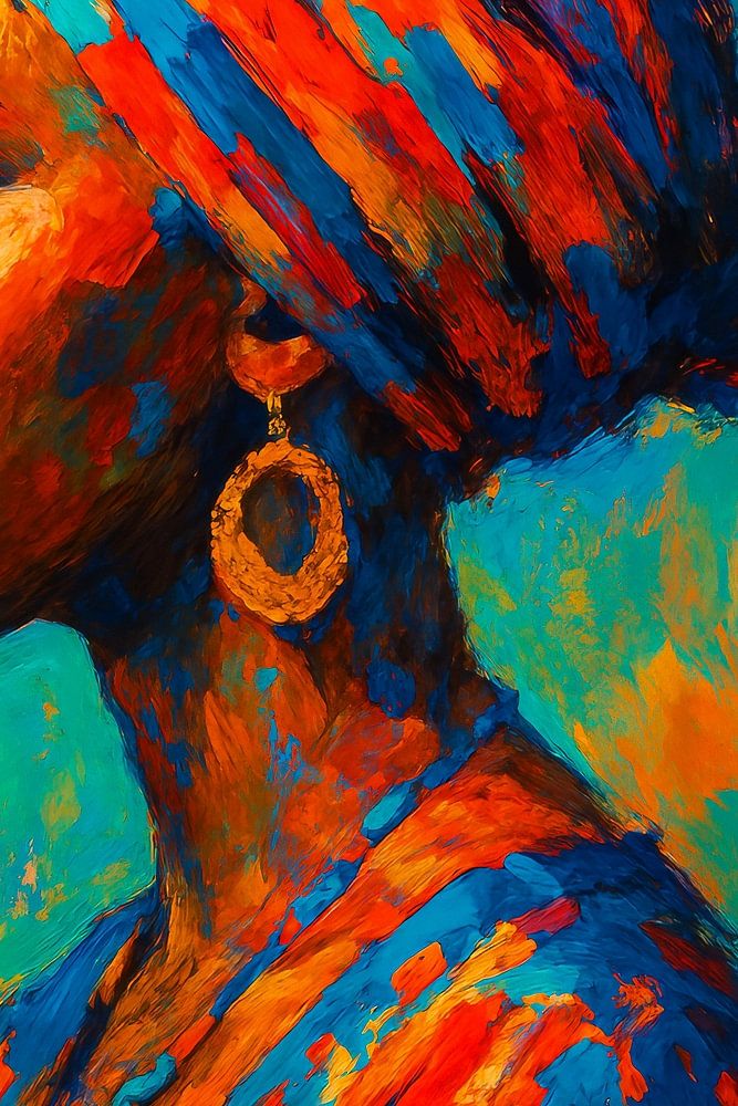 Ein ausdrucksstarkes und kraftvolles Porträt einer kopftuchtragenden Frau, eingehüllt in feurige Farben, die ihre Würde und ihren Stolz unterstreichen. Die intensiven Pinselstriche und die farbenfrohe Palette erwecken ihre Persönlichkeit auf eine Art und Weise zum Leben, die immer wieder fesselt.