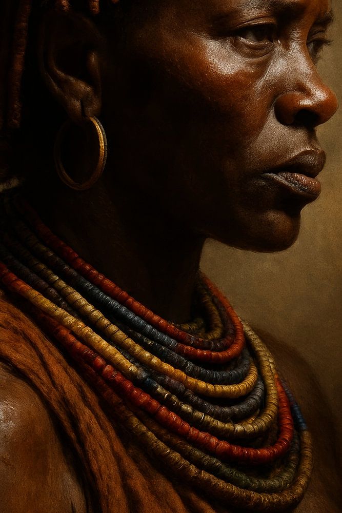 Dieses intensive, klassische Porträt zeigt eine stolze Hamar-Frau aus Äthiopien, gekleidet in warmen Erdtönen und mit reich verziertem Perlenschmuck. Das malerische Licht und der kraftvolle Blick erzählen eine Geschichte von Erbe, Würde und Identität.