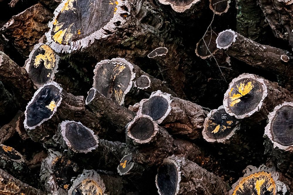 Ein Haufen mit Baumstämmen. Die gelben und grünen Spuren von Algen sind deutlich sichtbar. Ich fand es ein schönes grafisches Bild.