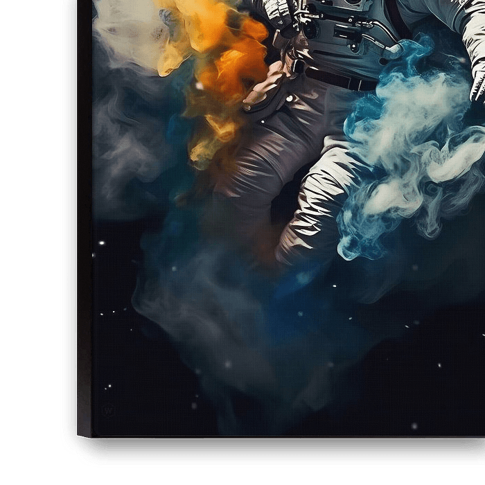 Sternenstaub-Treiber. Ein Astronaut, der durch eine wunderschöne Wolke aus wirbelndem, vielfarbigem kosmischem Rauch schwebt. Eine Reise in das vibrierende und ätherische Herz eines Nebels.