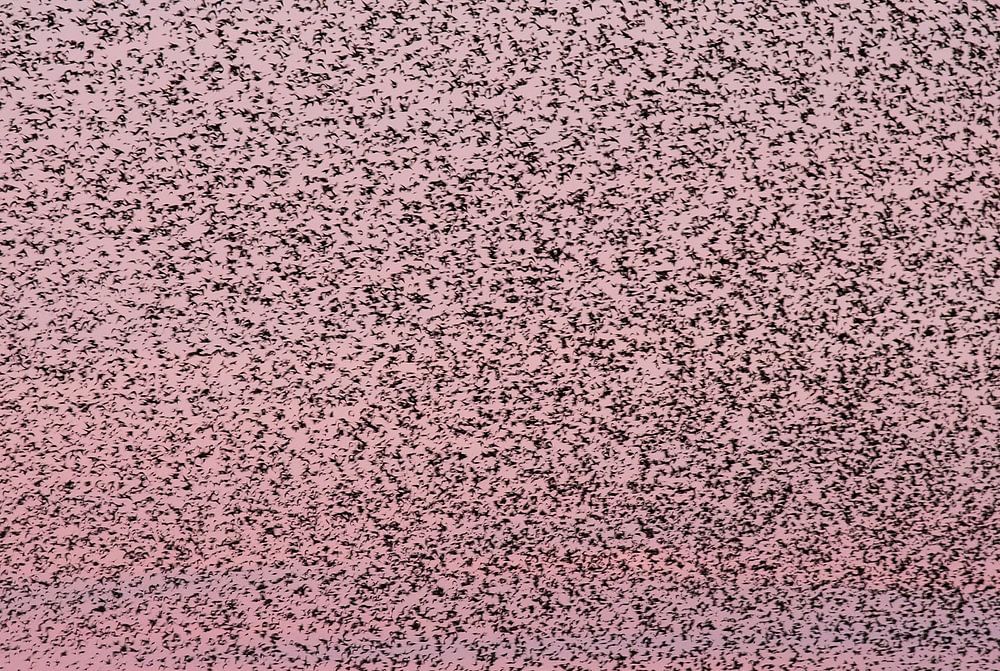 Am Himmel bietet sich ein phantastisches Schauspiel mit einer großen Schar von Staren, die mit den Farben der untergehenden Sonne kontrastieren.