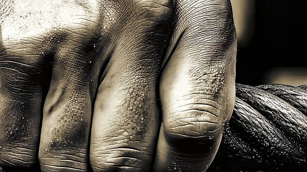 Nahaufnahme einer muskulösen Hand, die ein dickes Stahlkabel fest umgreift. Die Szene vermittelt Stärke, Kraft und Entschlossenheit in einer herausfordernden industriellen Umgebung.