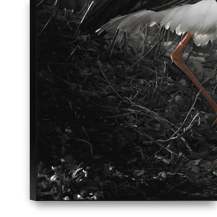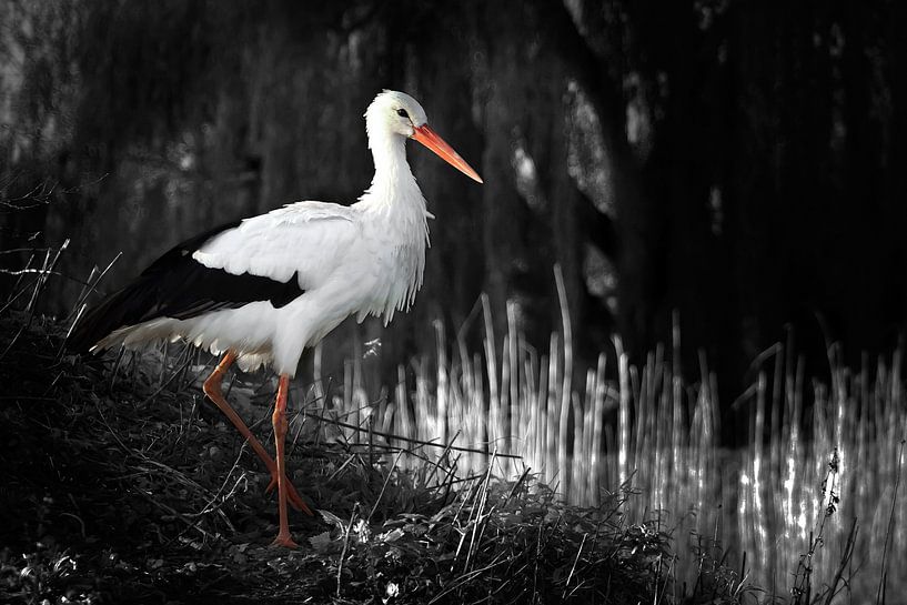 Stolz blickt dieser Storch über die schwarz-weiße Landschaft um ihn herum. Sein roter Schnabel sticht hervor. Ein schönes Zusammenspiel von Schwarz-Weiß und Farbe.