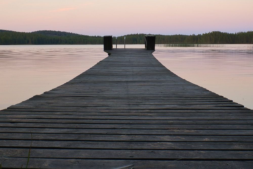 Steg der in einen schwedischen See reicht. Stillleben in der skandinavischen Natur.