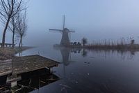 Die Boezemmolen in Haastrecht blicken auf den Polder. Auf der anderen Seite des Wassers befindet sich eine kleine Anlegestelle, an der Kanus und Schaluppen festmachen können. Heute Morgen ist von der schönen Umgebung wegen des dichten Nebels wenig zu sehen.