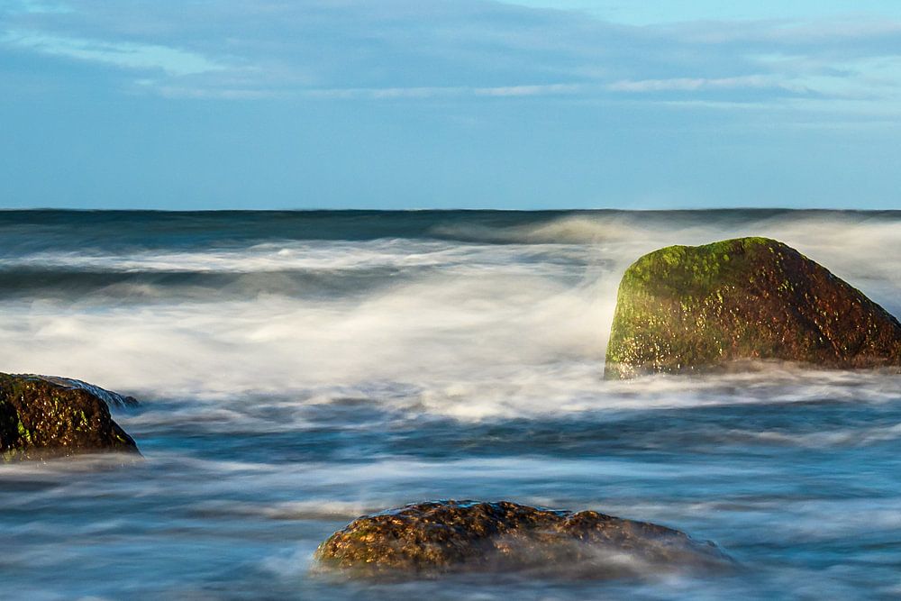 Steine an der Ostseeküste bei Warnemünde an einem stürmischen Tag.