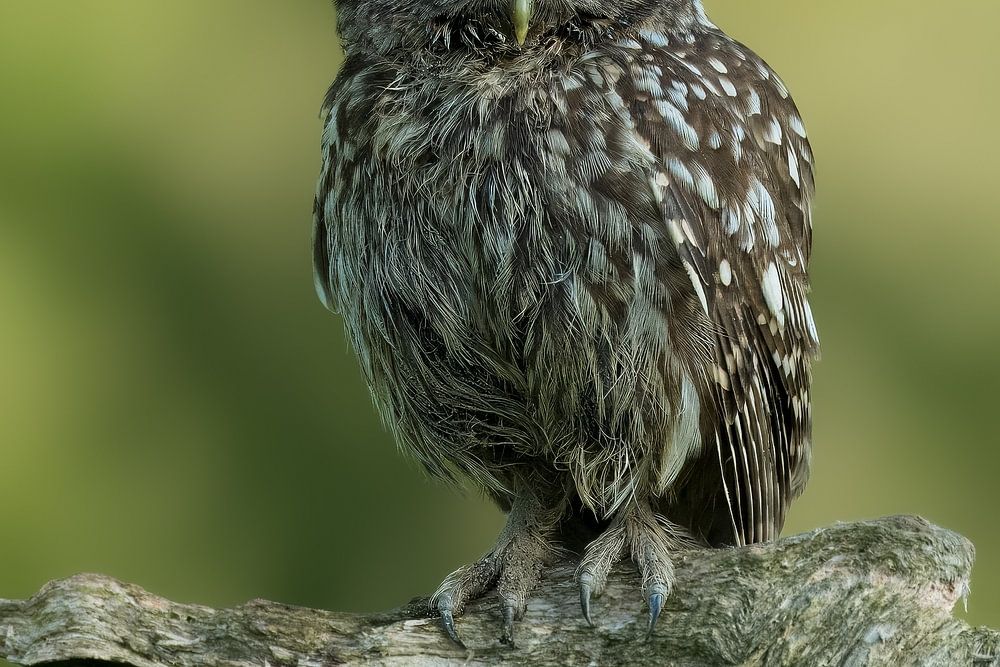Der Hintergrund ist unscharf und besteht aus sanften Grüntönen, was den Fokus auf die Eule legt und einen natürlichen Lebensraum suggeriert. Die Beleuchtung ist weich und gleichmäßig und hebt die Eule gut hervor, ohne harte Schatten zu werfen. Das gesamte Bild strahlt ein Gefühl der Ruhe und Beobachtung aus, wobei der Blick der Eule eine gewisse Neugier oder Wachsamkeit ausdrückt.