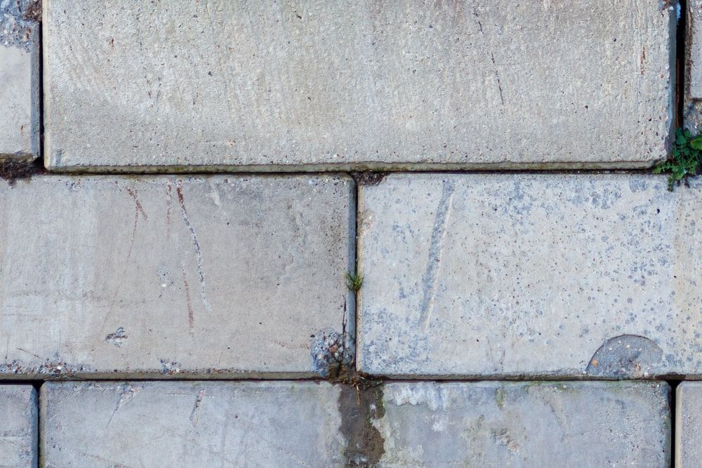 Ein künstlerischer Anblick aus grob behauenen, gezeichneten Steinen, Farben und einem Stück Natur in Form von Unkraut, das seinen Platz beansprucht.