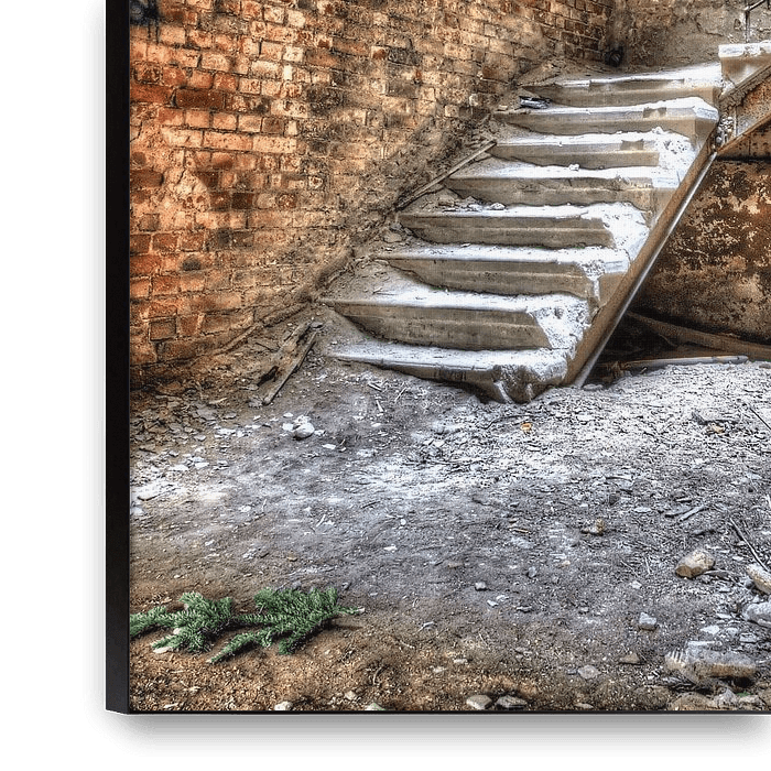 Bestelle das Foto Steintreppe in einem alten und verlassenen Militärkrankenhaus/Sanatorium von Tineke Visscher als Reproduktion auf Leinwand, Alu-Dibond, als Poster, Fototapete oder Acrylglasbild.