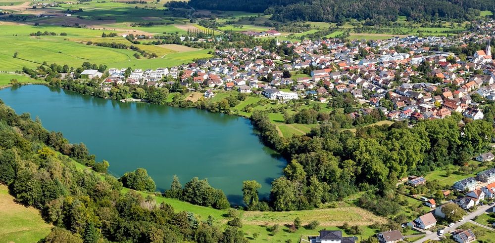 Die Hegau-Gemeinde Steißlingen mit dem Naturbadesee Steißlingersee im Landkreis Konstanz