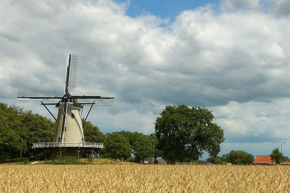 Bestelle dieses Landschafts-Wandbild Stelling Mühle gegen blauen Himmel mit Wolken von Ad Jekel als Reproduktion auf Leinwand, Alu-Dibond, als Poster, Fototapete oder Acrylglasbild.