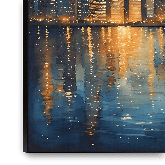 Eine lebendige und romantische Darstellung einer nächtlichen Stadtsilhouette, gerendert in einem schönen Aquarellstil. Die Gebäude leuchten in warmem, goldenem Licht, das sich brillant auf dem ruhigen, dunkelblauen Wasser spiegelt. Der Nachthimmel ist von einem tiefen, satten Blau und mit unzähligen funkelnden Sternen übersät, darunter…