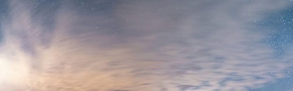 Panorama von einem bewölkten Sternenhimmel. Durch das Lichtspiel mit den Wolken wirkt alles sehr atmosphärisch.