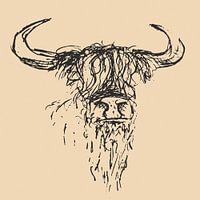 Dieses quadratische Kunstwerk hat einen cremefarbenen Hintergrund und anthrazitfarbene Linien. Sie sehen einen handgezeichneten Kopf des schottischen Highlander-Stieres. Die Zeichnung ist in einem skizzenhaften Stil gezeichnet. Die groben Linien haben einen weichen Schatten, der den Eindruck erweckt, dass sie in die Leinwand eingraviert…