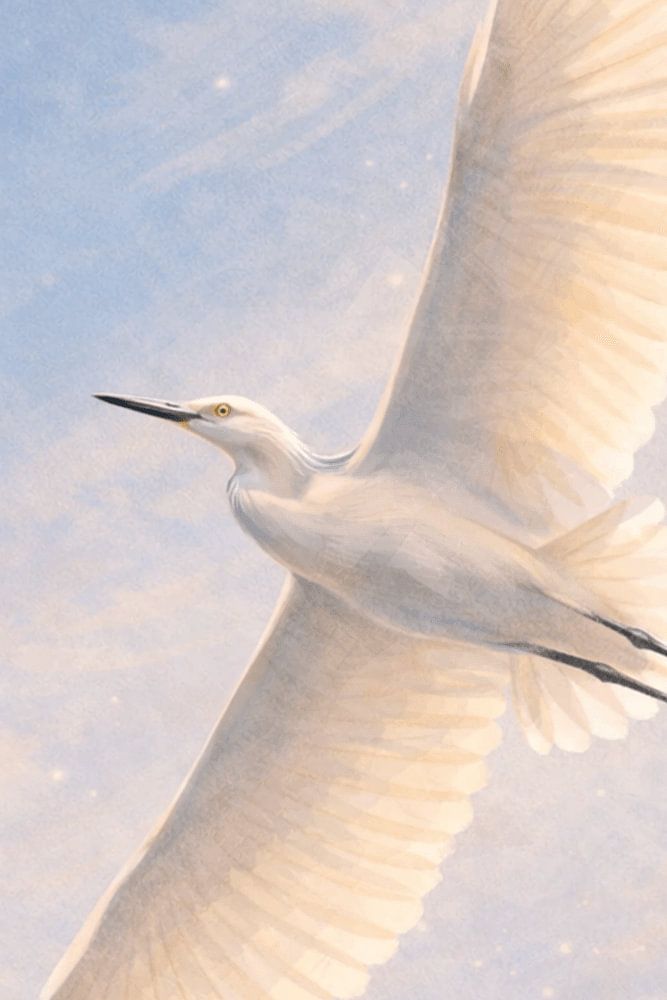 Über „Stille Anmut – Weißer Reiher im Flug“ von Urbanwolves