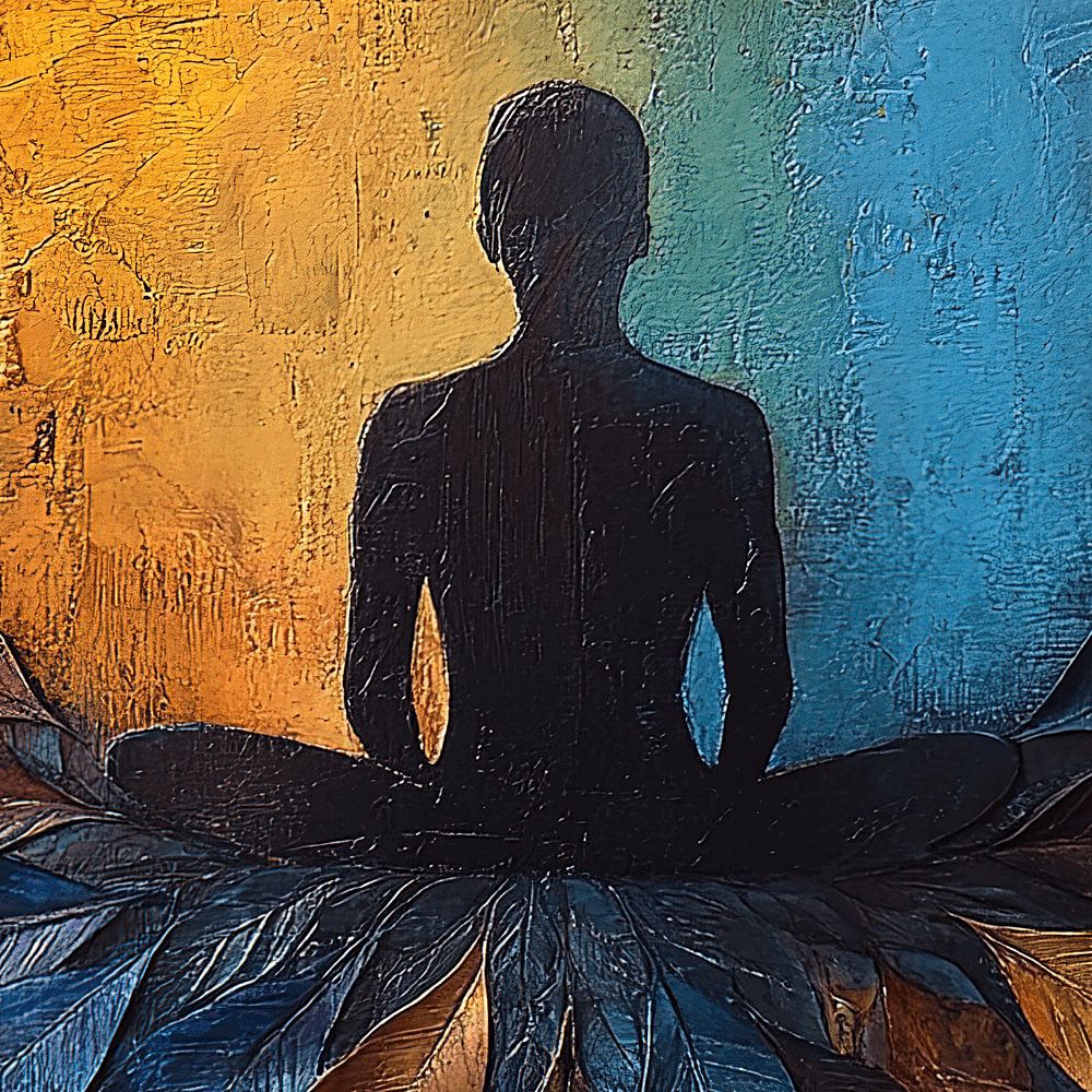"Stille Blüte" fängt die Essenz von innerem Frieden und spirituellem Wachstum ein. Die Silhouette einer meditierenden Figur tritt aus einer strahlenden Mischung warmer und kühler Töne hervor, umgeben von abstrakten Blättern, die eine Verbindung zur Natur symbolisieren. Dieses Werk lädt den Betrachter in einen Raum der Ruhe ein und ermutigt zu einem Moment der Reflexion und Harmonie mit der natürlichen Welt.