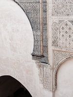 Das Bild zeigt einen Ausschnitt aus einer Wand in Marrakesch, Marokko. Die Wand ist glatt verputzt und hat eine sanfte beige Farbe. Der Putz weist Formen auf, die an Türrahmen und andere dekorative Elemente erinnern. Die Figuren sind nicht gemalt, sondern durch Reliefs im Stuck entstanden. So entsteht ein ruhiges Bild, bei dem die…