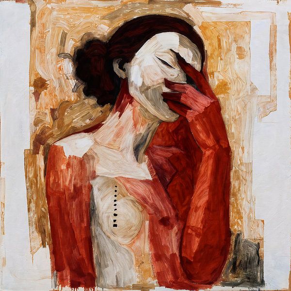Dieses Gemälde ist ein unverfälschter Ausdruck menschlicher Verletzlichkeit und Emotionen, eingefangen durch kühne Pinselstriche und eine begrenzte, ausdrucksstarke Farbpalette. Als Künstler wollte ich die Spannung zwischen Verbergen und Enthüllen erforschen und nutzte die Geste der Figur – die ihr Gesicht mit einer leuchtend roten Hand…