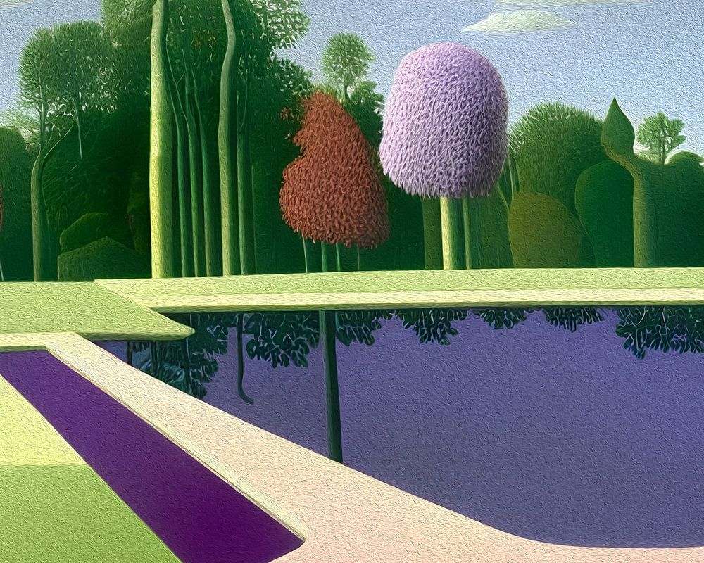 Das digitale Kunstwerk zeigt einen ruhigen, surrealen Park mit einem Teich, dessen Wasser dunkel und geheimnisvoll reflektierend ist. Seltsame Bäume säumen den Rand des Pools. Das Ganze ist in sanften Farbtönen gehalten, die eine verträumte und ruhige Atmosphäre schaffen. Es ist ein faszinierendes und bezauberndes Bild, das den Betrachter dazu einlädt, weiter zu starren und die geheimnisvolle Atmosphäre zu erkunden. Dieses digitale Kunstwerk wurde mit verschiedenen Techniken wie digitaler Malerei, Fotomanipulation und KI-Technologien erstellt.
