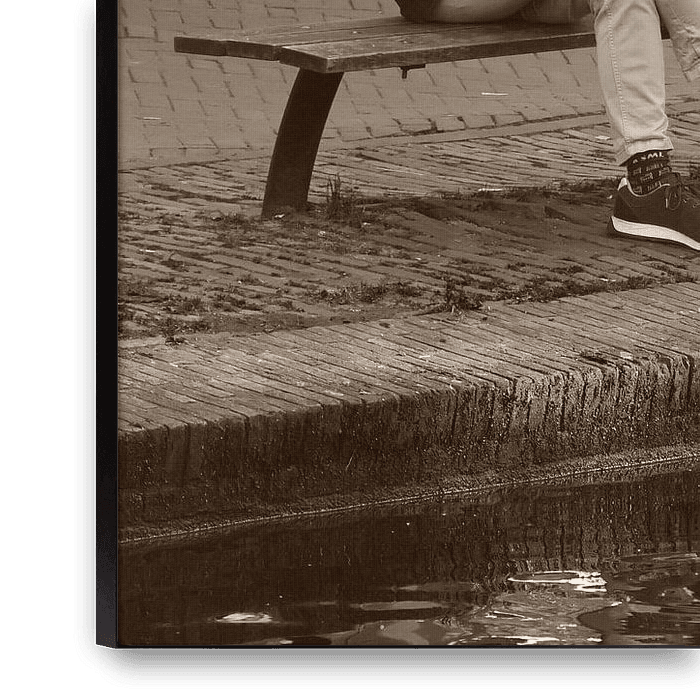 Diese Schwarz-Weiß-Fotografie fängt einen Moment von unaufdringlicher Schönheit und Besinnlichkeit ein. Zwei Männer sitzen zusammen auf einer Bank am Wasser und essen ein Sandwich. Ihre Silhouetten sind zurückhaltend und fügen sich harmonisch in die friedliche Umgebung ein. Vor ihnen schwimmt ein anmutiger Schwan im Wasser und hofft auf…