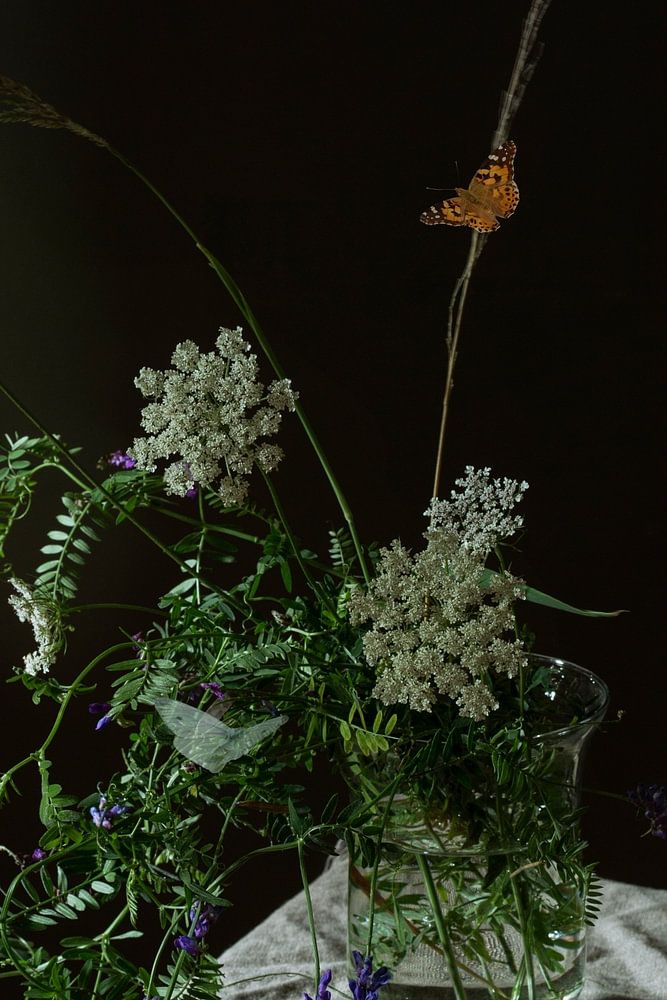 Stilleben vertikal in einer Glasvase mit u.a. Vogelwicke auf einem Tisch mit Muscheln auf einem Leinentuch in neutraler grauer Farbe. Vor einem dunklen Hintergrund.