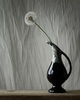 Stilleben einer verblühten Pusteblume in einem dekorativen Krug. Hintergrund zerknülltes Seihtuch.
