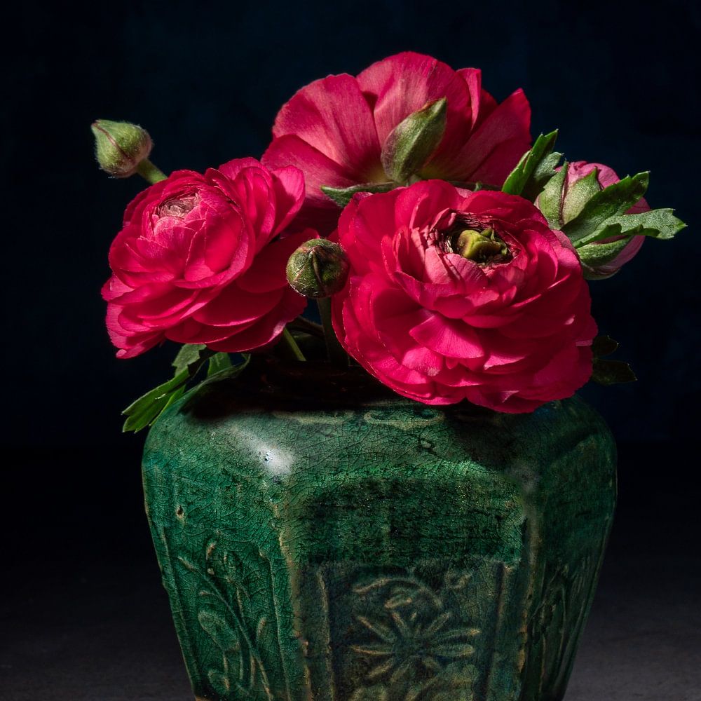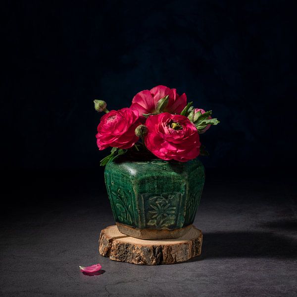 Dieses Stillleben aus Odas Serie Sweet Petit konzentriert sich auf das Spiel von Licht und Schatten. Mit sorgfältig gerichtetem Licht werden die Anemonen fast greifbar: samtige Blütenblätter in tiefen Rot-, Rosa- und Himbeertönen leuchten vor einem dunklen, gedämpften Hintergrund. Jedes Detail, von den subtilen Adern in den Blüten bis…