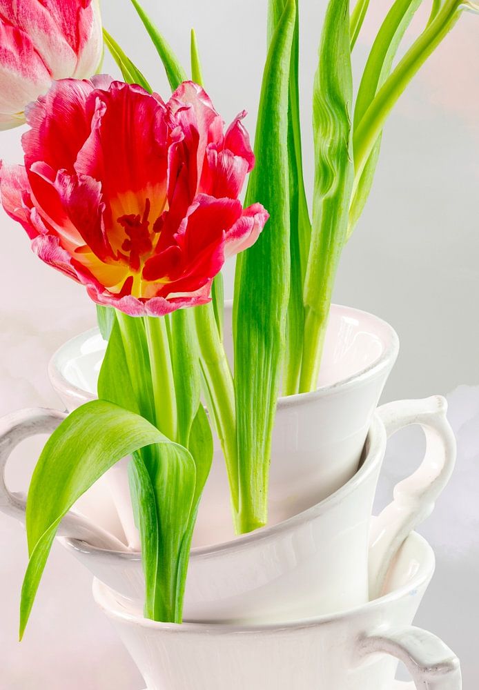 Vertikale Fotocollage eines Stillebens mit 3 gestapelten weißen Tassen und Untertassen, die drei frische, rosarote Tulpen auf einer blattreichen Tischplatte zusammen mit einer weißen Schale enthalten. Alles gegen einen hellen, bewölkten Himmel. Dieses Bild bringt Licht, Frische und Frühling in Ihr Zuhause!