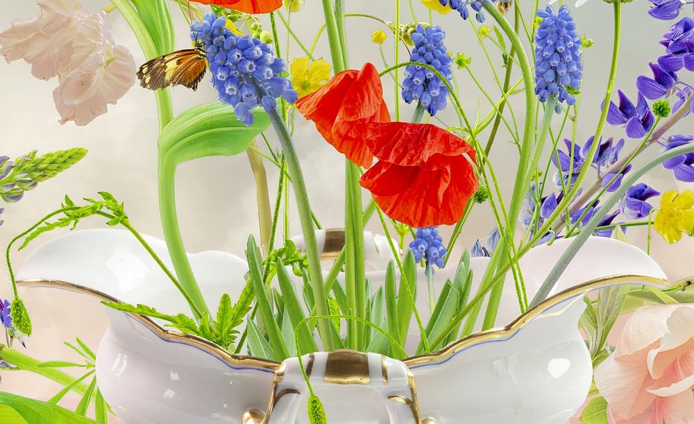 Stilleben, horizontale Fotocollage eines belaubten, hellen Tisches, darauf eine weiße Sauciere von Hütschenreuter mit Goldglanz und dünnem blauen Rand, die einen Strauß blauer Trauben mit Mohnblumen, Butterblumen, Lupinen und Tulpen enthält. Alles vor einem leicht bewölkten Hintergrund.