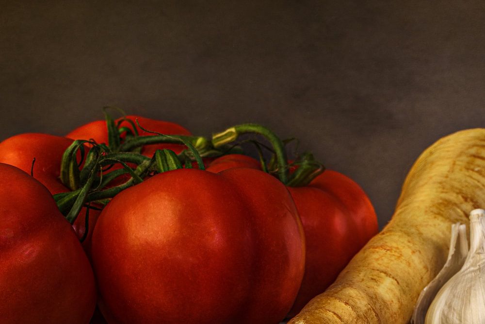 Stilleben mit Strauchtomaten, Pastinake und Knoblauch auf einem Steinboden.
